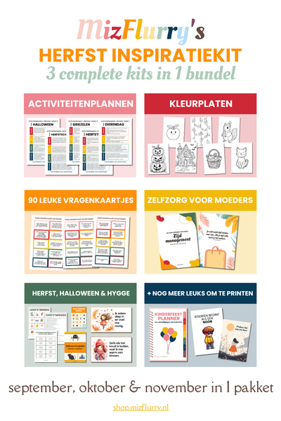 MizFlurry’s Herfst Inspiratiekit is een goedgevulde bundel voor dagen waarop je zin hebt in gezelligheid, maar niet in eindeloos zelf bedenken wat je nu weer kunt doen. Je krijgt activiteiten voor kinderen, kleurplaten, leuke vragenkaartjes, zelfzorg voor moeders en een flinke stapel extra printables die perfect passen bij herfst, school, Halloween en knusse dagen thuis.