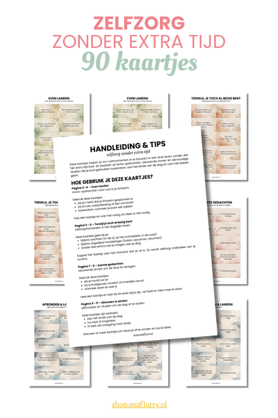 Zelfzorg zonder extra tijd is een printable set met 90 kaartjes die je helpen om rustmomenten te nemen terwijl je toch al bezig bent.
