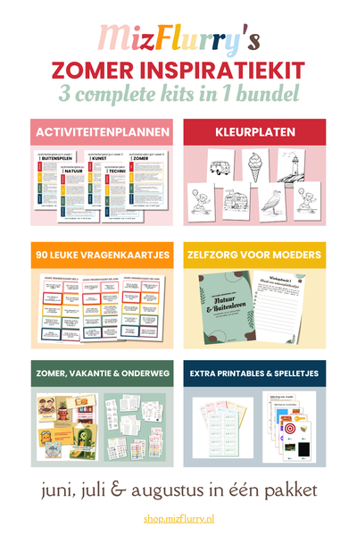 MizFlurry’s Zomer InspiratieKit is jouw vakantie-redder in printable-vorm. Een grote bundel vol activiteiten voor kinderen, kleurplaten, leuke vragenkaartjes, zelfzorg voor moeders en extra’s die perfect passen bij de zomer, vrije dagen en lange middagen waarop je wel iets leuks wilt doen, maar niet eerst zelf een plan wilt bedenken.